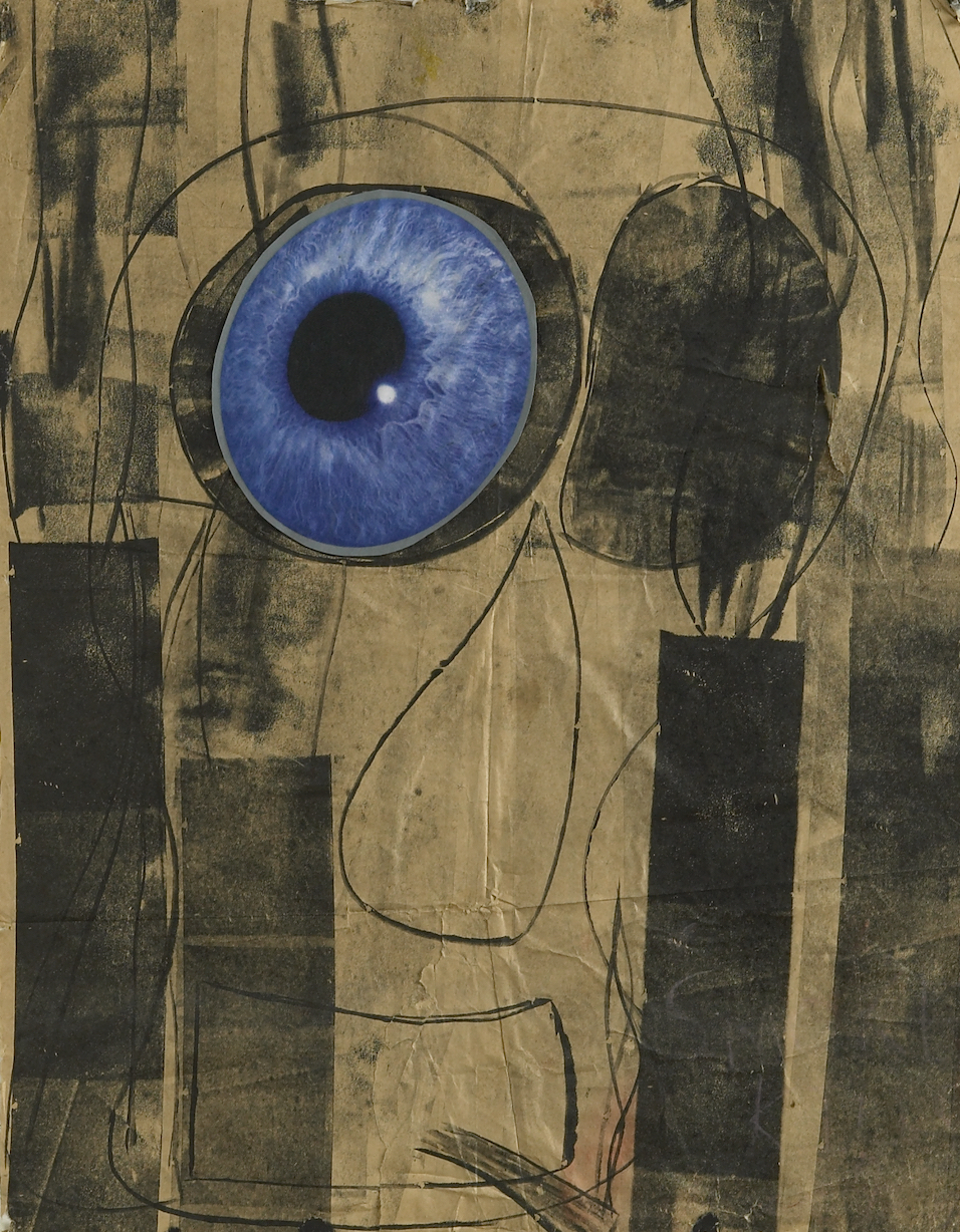 Arthur had just painted a landscape. The studio rang with applause. I decided that this would be a dramatic moment for me to make my entry. To the amazement of all my friends, I strode over to the large empty canvas and picked up a large medical book and began cutting out a heart. I glued it onto the canvas. This was followed up by the gluing on of a brain. Followed by a question mark above the word God. Next I cut out an inner ear and a DNA spiral. This was followed by the fixing of a human eye to the canvas. I hunted through more books for other pictures to glue on. I had been collecting these books for weeks to help me make this artwork.